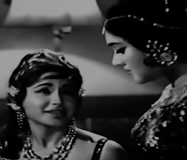 Geeta (Vyjanthimala) is a fiesty college girl. She is good at studies and dancing and the upholder of Indian values. Her friend is Shanta (Helen), who is married. Shanta is the opposite of Geeta and influenced by western culture. Shanta’s husband Jagdish has returned from London and Shanta is aghast to find him unaffected by western influences and insisting on Indian values. Another classmate is Kundan (Prem Chopra) who is supportive of Shanta’s thoughts as a modern, independent woman.