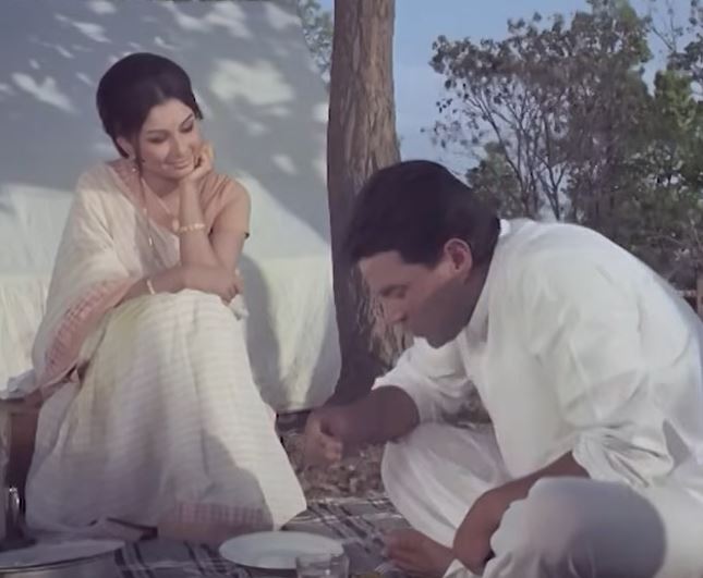 Sath, Chatterjee and Shyam Sunder are staying at the guest house. The caretaker is Rustom (David). They are served by a young girl Ranjana (Sharmila Tagore). Ranjana’s mother had run away with a driver. Apparently, Ranjana is the driver’s daughter. Kunwar has his sights on her and she entertains him with a song when he is alone in his suite.