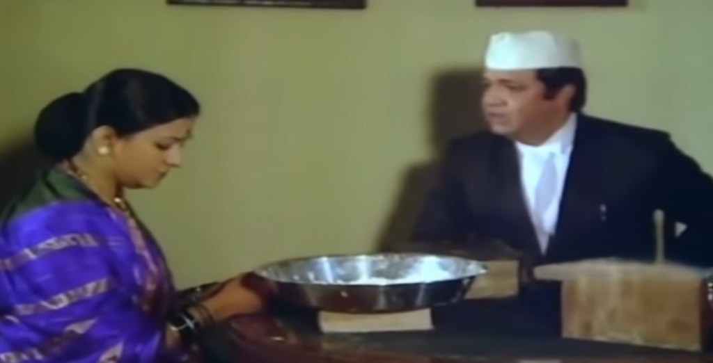 Back home, there is a visitor who invites Pandit Shastri to Karnataka, where he will be felicitated and gifted a toda (anklet). Facilitating the conversation is Pandit Shastri’s lawyer friend Madhav (Deven Verma). He is a friend and well-wisher of the family. Pandit Shastri accepts the invite and prepares to leave by train. And guess who joins him? Tulsi!