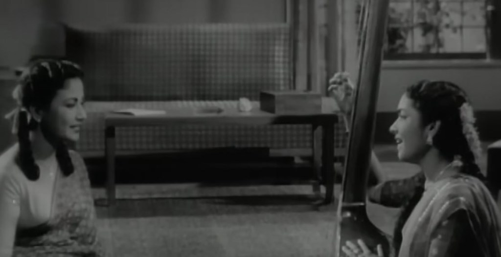 For once, Meena Kumari’s character is not weepy. She alternates between the irritated character only to mellow down a bit and return to her original form effectively. Gemini Ganeshan is credited as Ganesh and plays the role adequately. Strangely, there is no romantic track shown between the supposedly married characters. They are always bickering and playing the blame game which becomes repetitive. And joining them is Om Prakash’s character which becomes predictable as the film progresses. Kishore Kumar is impressive and plays a character that does not want to do anything with music. He even sings a song Gaana naa aayaa, bajaanaa naa aayaa. Again, there is no romantic involvement shown with Jamuna’s character though they are supposed to get married.