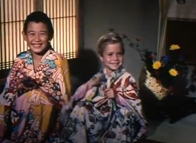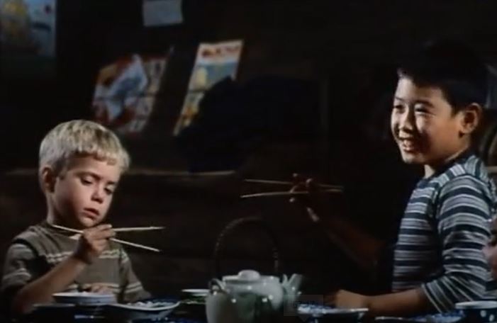 But Tony is safe and sound! He is floating in the water on a life raft, wet and hungry but otherwise fine. Its a foggy morning. Tony’s raft is sighted by a young Japanese boy Hiko (Roger Nakagawa). Hiko is on a fishing boat with his father Kei (Susumu Fujita) and mother Michiko (Kuniko Miyake). The family is out fishing in the sea. They bring Tony on board, make him warm and feed him. Luckily, Hiko speaks English and starts conversing with Tony. Both the boys soon become friendly. There is a fun scene when Tony is hungry and “learns” the use of the chopsticks, courtesy Hiko.