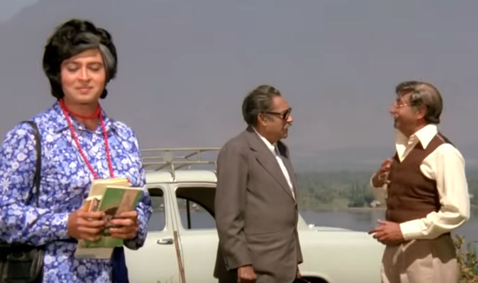 The scene shifts to Srinagar. We again have 2 friends from different religions – retired Colonel Thakur Vikram Singh/ TVK (Pran) and retired SP Inshallah Khan/ IK (Ashok Kumar). They are arguing about the welfare of their daughter. Their caretaker cum butler is Idea (Deven Verma) whose full name is Ishwar Damodar Eknath Acharekar (IDEA). Idea informs IK that some men are waiting for him in the guesthouse. IK realises he is referring to the the applicants for the post of the Urdu tutor. So it was IK who had published the advertisement without informing TVK. IK explains that he would want their daughter to learn Urdu etc..