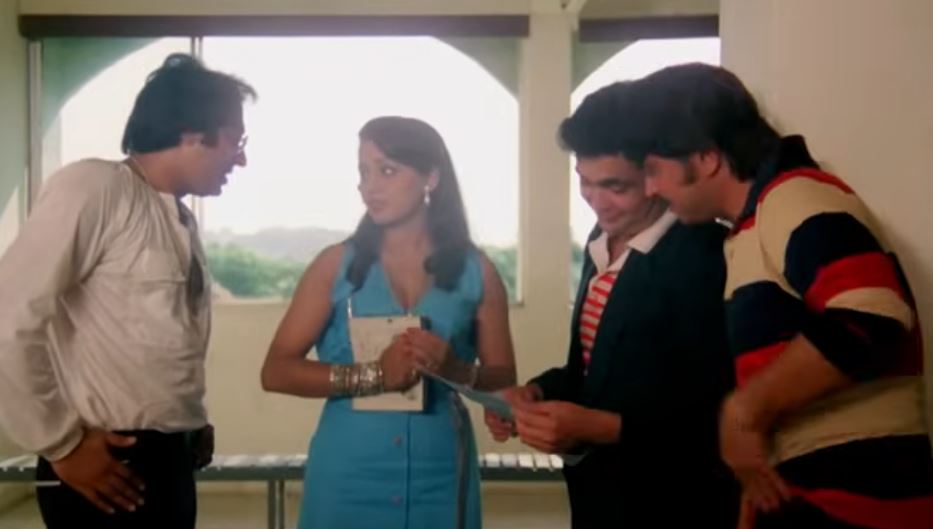 One student not happy with Ram and Rahim’s success is Kundan (Ranjeet). Kundan is a spoilt rich guy (man?). He has been trying to clear his exams since 6 years and is known to have cheated a few girls. Kundan tries to help a student Meena (Shoma Anand) who is confused about the subject selection for the new academic year. Kundan steps in to guide her (and in turn flirt with her.) Ram and Rahim hear the conversation and mock Kundan, calling him uncle and highlight his multiple attempts in clearing the exam. Kundan insults both of them, talking about their dress sense and indirectly referring to their economic condition. As evident, this is a typical college grudge which may lead to serious consequences.