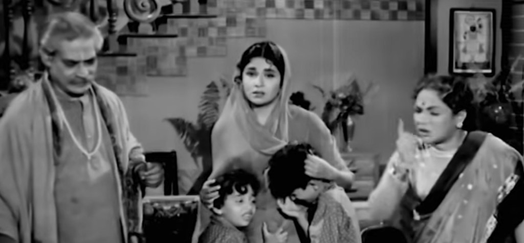 Gharana tells the story of a wealthy family. The head of the family is Rai Bahadur Ramdas (Bipin Gupta) who doesn’t have any say in the running of the house. His favorite phrase is “Ichcha bhagwan ki” meaning “it is the god’s will” and basically admitting he is helpless. The real controller is his wife Shanta (Lalita Pawar), who doesn’t stay or let others stay peaceful for a moment. You can call her a dictator, a terror. Shanta’s typical day begins by calling out loudly to her daughters in law and make them slog the whole day. No one including her husband dare to defy her. They just let the things be as they are.