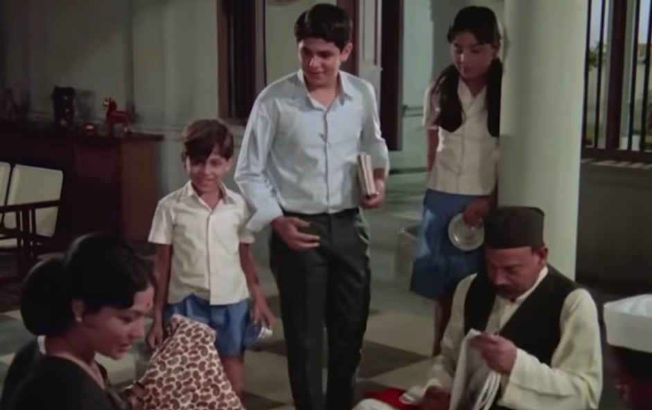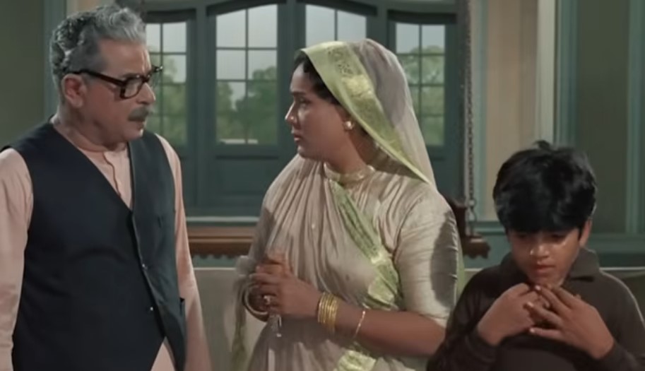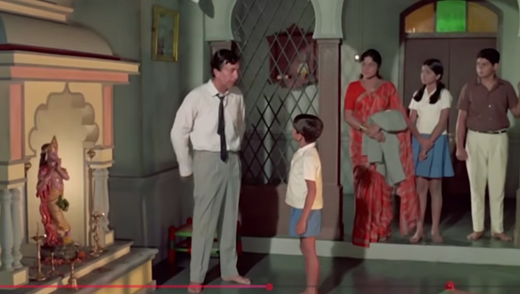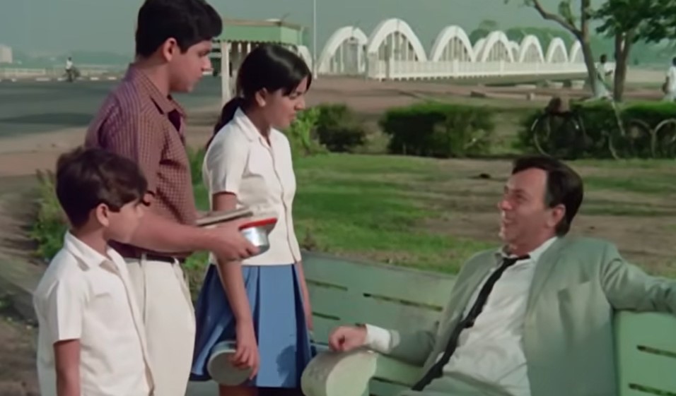 Ravi’s school mate is Murli. His father is Sadhuram (Om Prakash). Sadhuram’s boss is Shankarnath. His character is opposite to that of Shankarnath and is an extremely corrupt man. His wife is Jamna (Shashikala) and they have 5 children. Thanks to his “under the table” dealings, he is able to afford every luxury. He readily gives the money to Murli for the school trip which Ravi is also hoping to join. Ravi ponders how Sadhuram is so well off when his boss is barely able to make ends meet. Month on month it’s the same story.