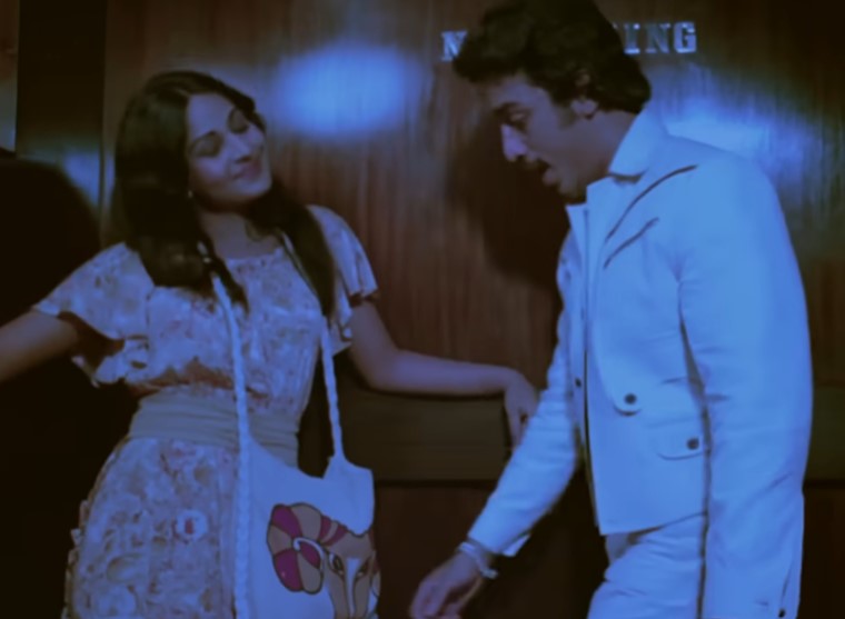 This is a kind of gimmick song which works because it’s made to be a part of the story. The hero Vasu (Kamal Hassan) has limited knowledge of Hindi. To impress the heroine Sapna (Rati Agnihotri), he sings this song made up of Hindi film names. The entire song is shot in a lift.