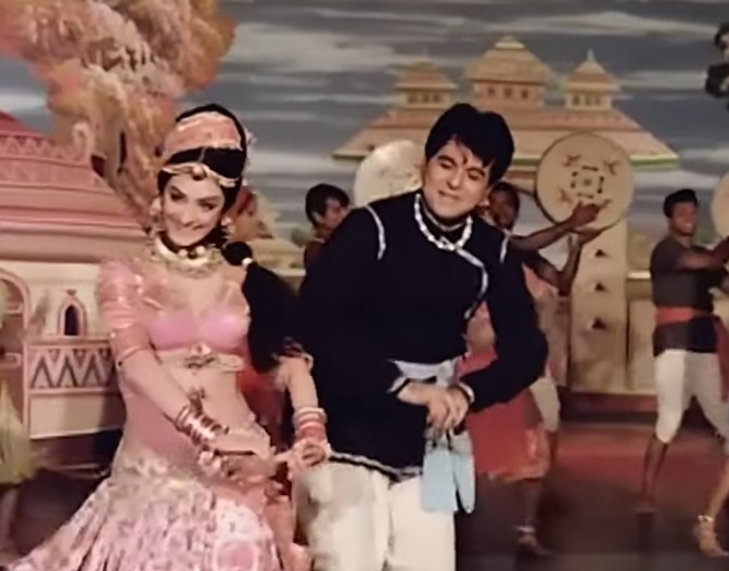 Let’s start with a dance number featuring the real life couple Dilip Kumar and Saira Banu. Both were highly successful in their careers. They did very few films together, including Gopi which became a hit. Coming to the filmi part of this song – the cleverly written lyrics weave the names of many movies and characters featuring the lead pair, making it an interesting song. It was probably the first song of its kind and showcases the star power and long lasting impact of films.