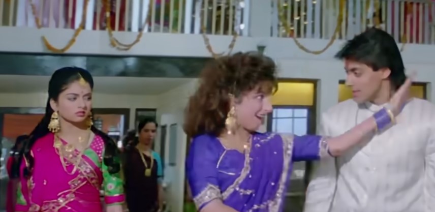 If we are talking about film songs, we cannot forget “Antakshari” – the well known game of film songs. Highly enjoyable and a perfect way to pass the time, it continues to be popular. Maine Pyar Kiya used this game with a mash-up of Hindi film songs as a way to bring the hero and heroine together. The hero Prem (Salman Khan) is adamant that the heroine Suman (Bhagyashree) apologize to him and say “I Love You” thrice. This happens during the course of the game when she finally relents and says the three words.