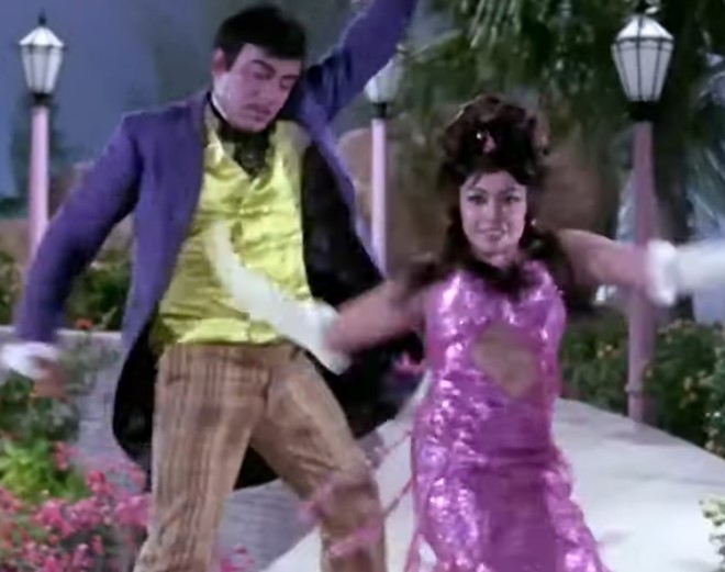 This song is a shooting sequence. The first shots show the song recording and we see some well known names including Kishore Kumar, Jaikishan and Anand Bakshi in front of the camera! Then Mehmood and Jayshree T participate in the song’s shooting. The lyrics are nonsensical but the tune is catchy with awesome singing.