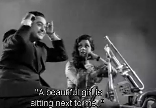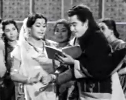 Our hero is Kavi Sudarshan (Kishore Kumar), who joins Nritya Kala Mandal as a poet cum singer. Here he meets the heroine Shobha Mathur (Kumkum), an actress and dancer. Sudarshan falls for Shobha. Its not exactly love at first sight! Shobha meets him dressed as an old woman (a character from the play) and then dances on his poetic creation as a young woman. Sudarshan falls for the younger version!